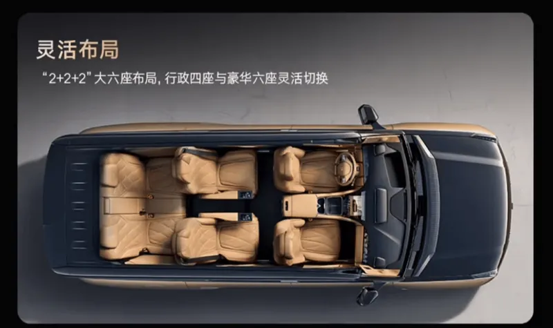 仰望 U8L 鼎世版采用“2+2+2”大六座布局,支持行政四座与豪华六座灵活切换,整车拥有 5.3m³ 座舱空间,二排最大膝部空间可达 280mm,后备箱最大容积达 1115L,可容纳 4 个高尔夫球包(最大容积为三排放倒后 4 座状态)。