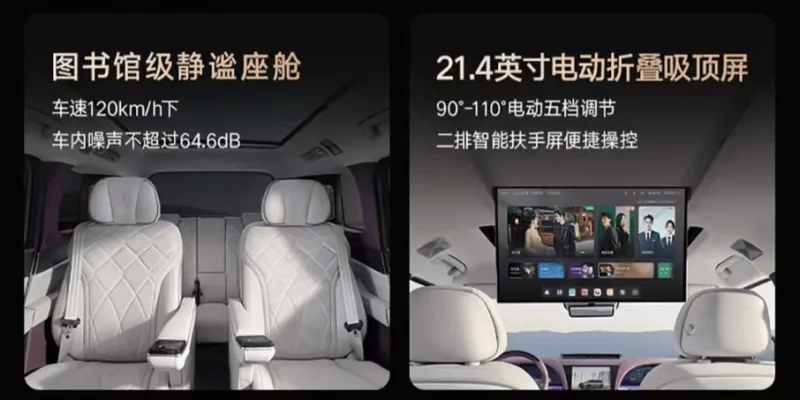 该车还配备全场景智能感光隐私车窗,支持自适应感光调节、主动隐私保护;拥有丹拿铂金证据系列 Hi-End 级 32 扬声器系统,支持杜比全景声,同时前排、二排均搭载独立头枕音响。